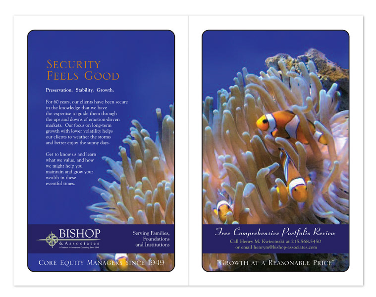 Since 2007 SKGD has been closely working with Bishop & Associates on all their branding, digital, collateral and advertising needs. First with a rebranding of the company and then a dynamic sales brochure targeted to their high net worth clients. We designed their email marketing campaign as well as online and print advertising. Current projects are two new logos for related business ventures. Bishop & Associate is a boutique wealth management firm devoted to serving the needs of ultra-high/high net worth individuals and families, and institutional investors. By creating panoramic portfolios that are risk tolerant, Bishop provides stability, wealth preservation, and growth through the use of diverse investment strategies. Celebrating over 50 years of service, they are the oldest privately held investment counseling firm in Philadelphia.