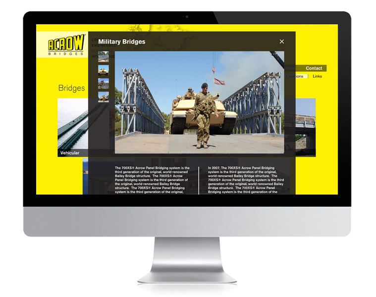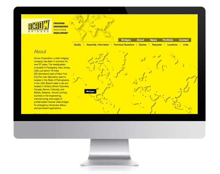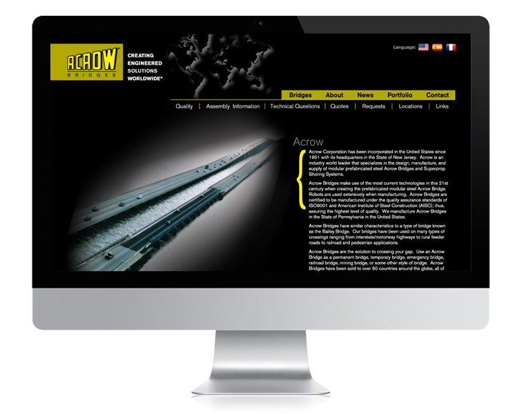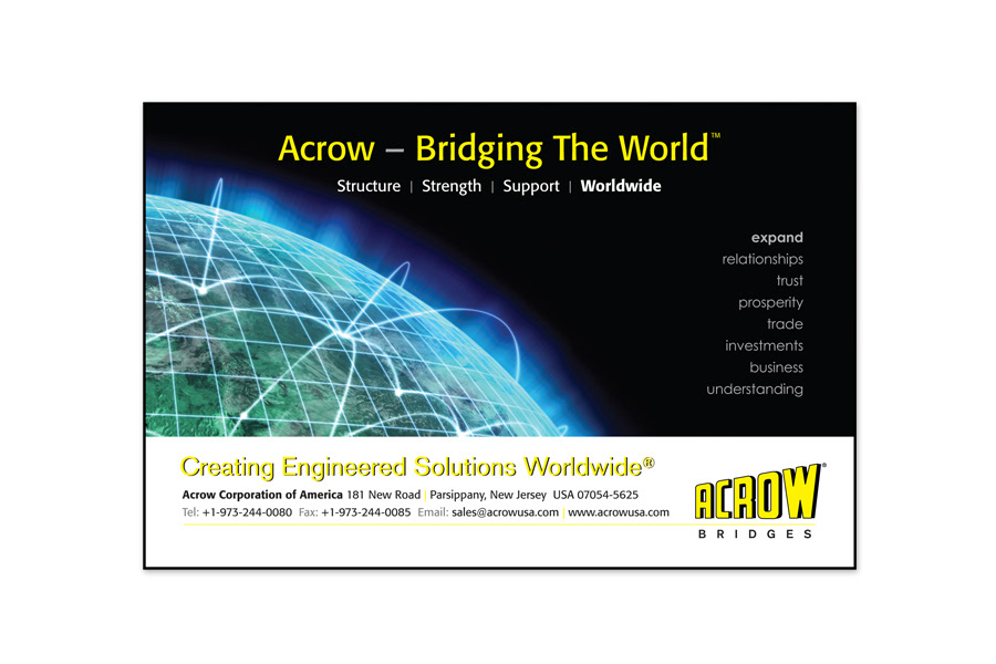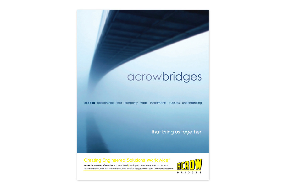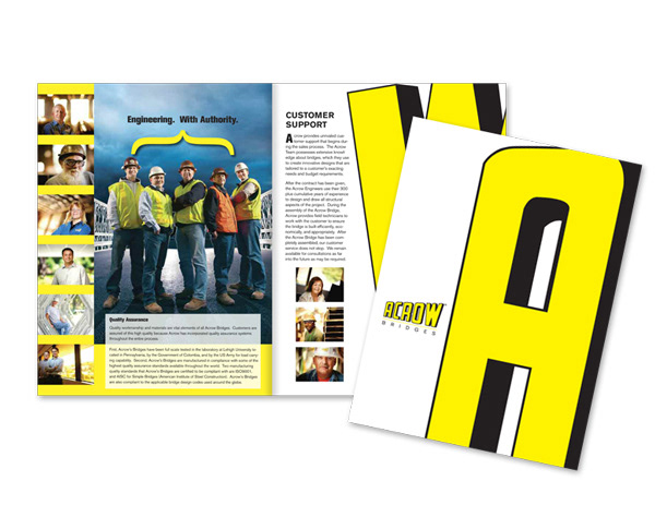 Partnered with ACROW Bridges for nine years to create international presence. We redesigned their corporate website and created all product brochures, trade show booth graphic, print ads, promotional collateral. Hired Philadelphia based photographer Dave Moser for a fresh perspective.
