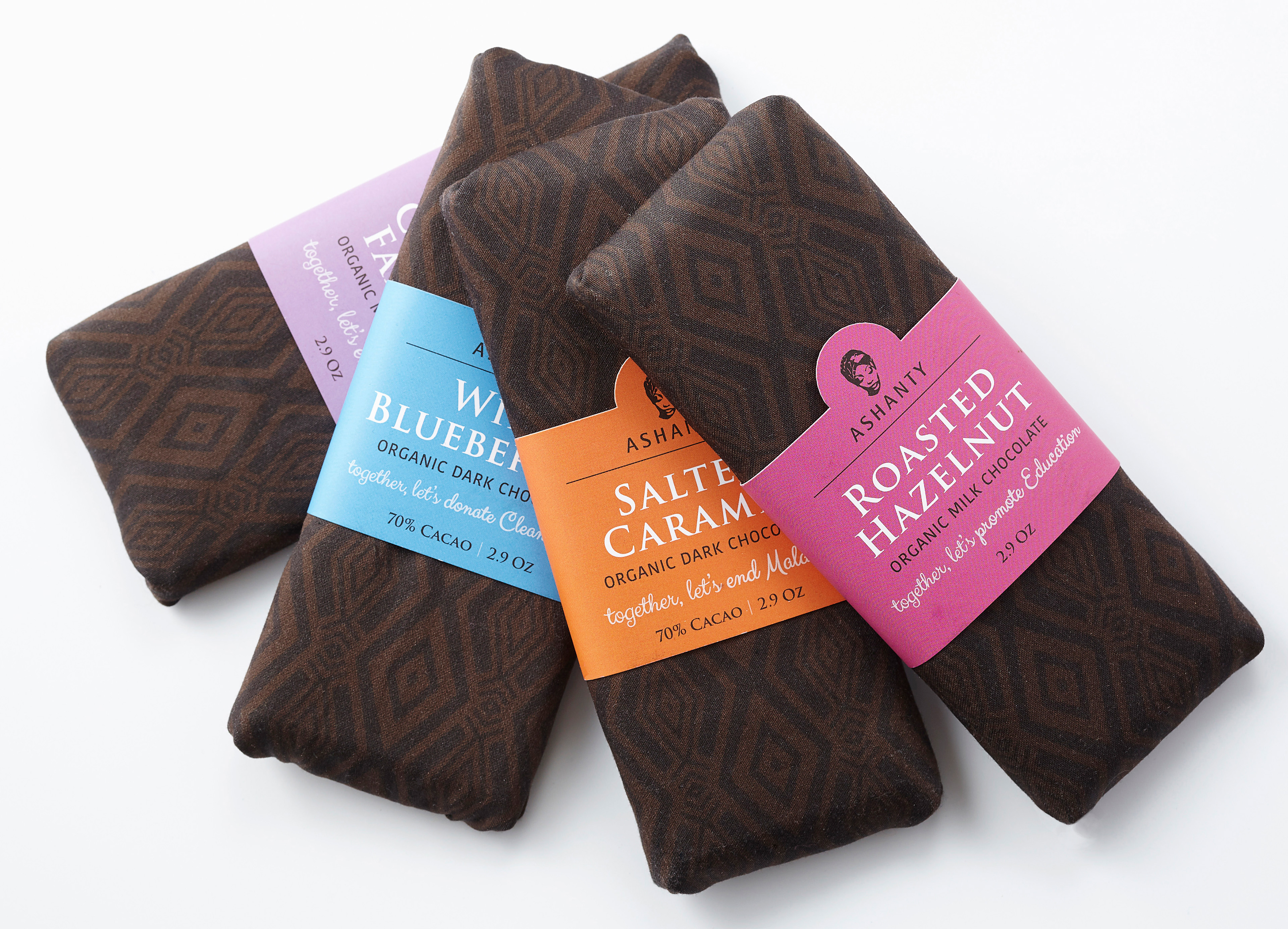 I am very pleased to announce that the new branding and chocolate packaging line designed for Ashanty Chocolate has begun production. The 4 flavors (2 dark, 2 milk) are each hand wrapped in gold foil, then a custom African inspired pattern, printed on cotton/silk fabric to create a very upscale impression. Using secondary colors and large readable type, the labels contrast with the dark chocolaty colored background making them pop off the shelf. 5% of profits from sales of the bars will go to a variety of causes. The bars will be sold at stores, green markets, online as well as corporate gifting in a branded mahogany box. Next project is applying the new branding to the rest of their product line of small bars, chocolate covered nuts, hot chocolate and a chocolate spread. Sweet success!