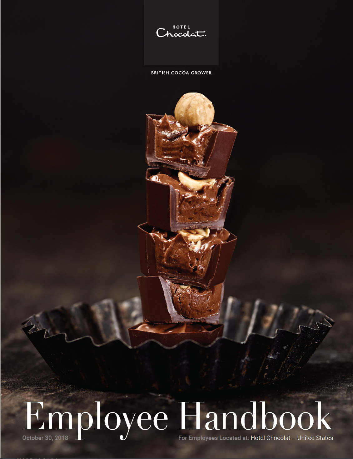 Collateral pieces including an Employee handbook design for British chocolate luxury brand opening stores in the US.