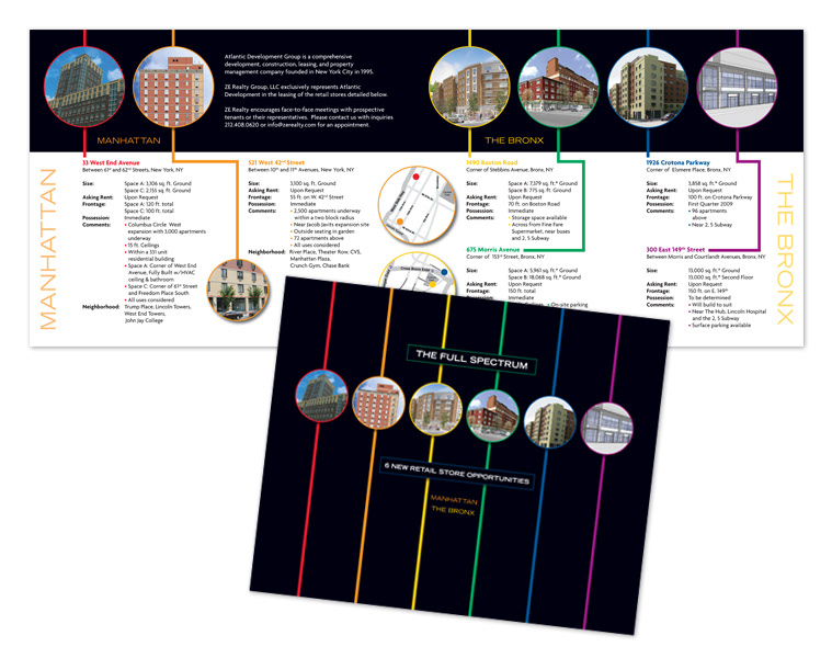 Brochure design for ZE Realty retail brokers and Atlantic Development Group highlighting six properties in Manhattan and the Bronx